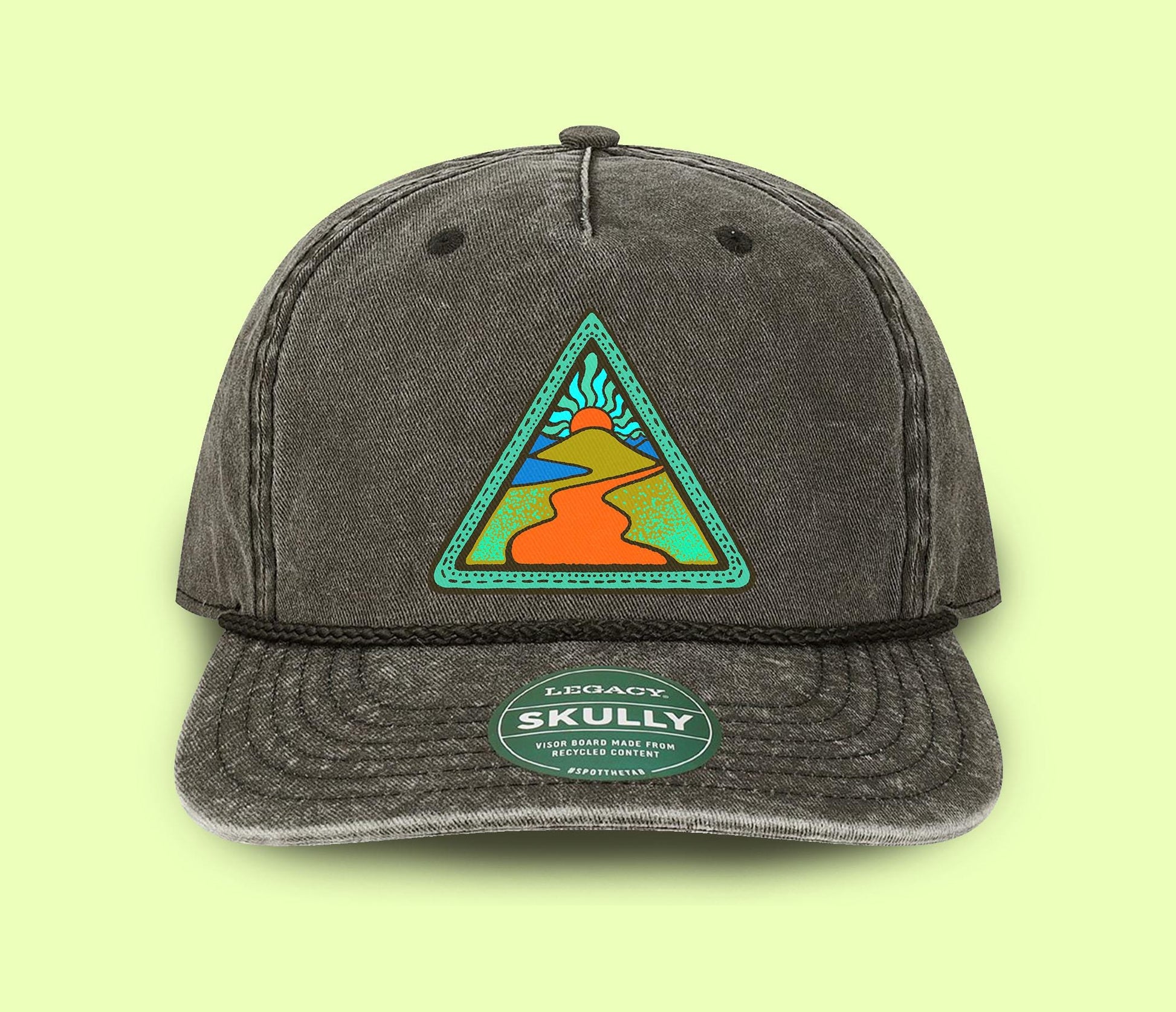 Printed on a stylish and comfortable green Richardson Umpqua hat or Black Denim Legacy Skully Cap. One size fits all, adjustable, UV protection, made of recycled materials.