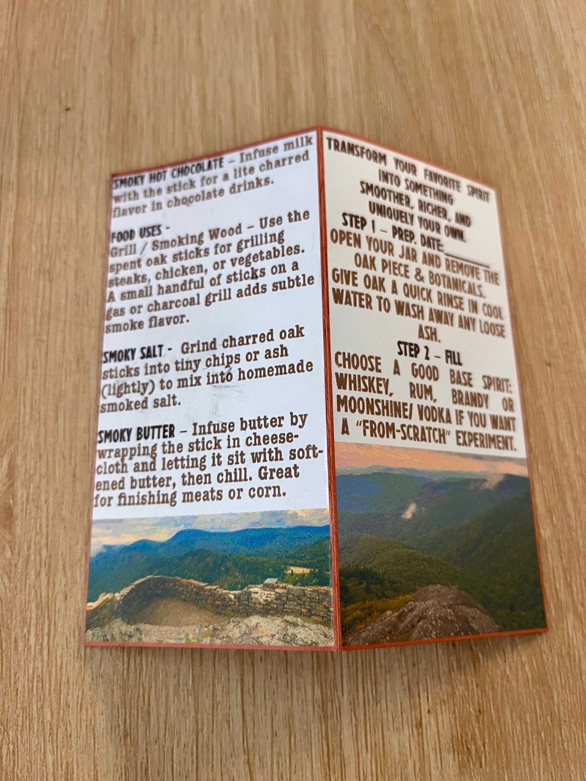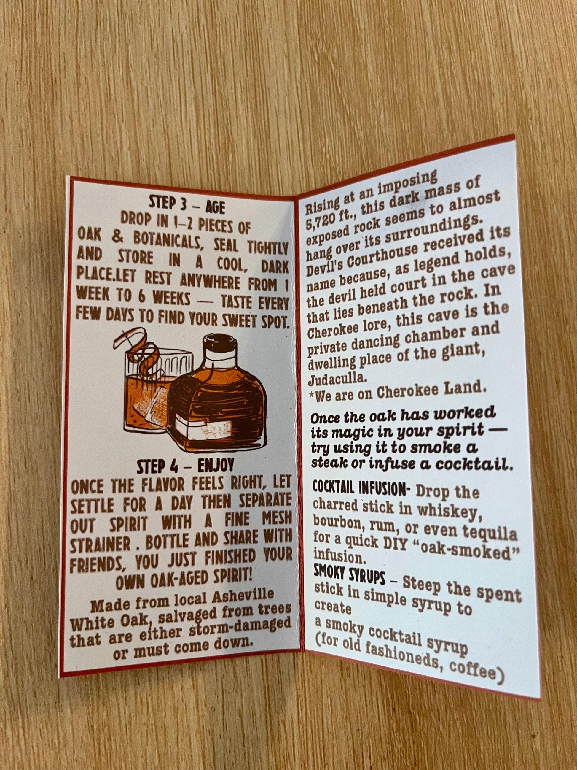 • Add the oak stick + botanicals to your favorite spirit (moonshine, whiskey, rum, tequila or whatever you’ve got).