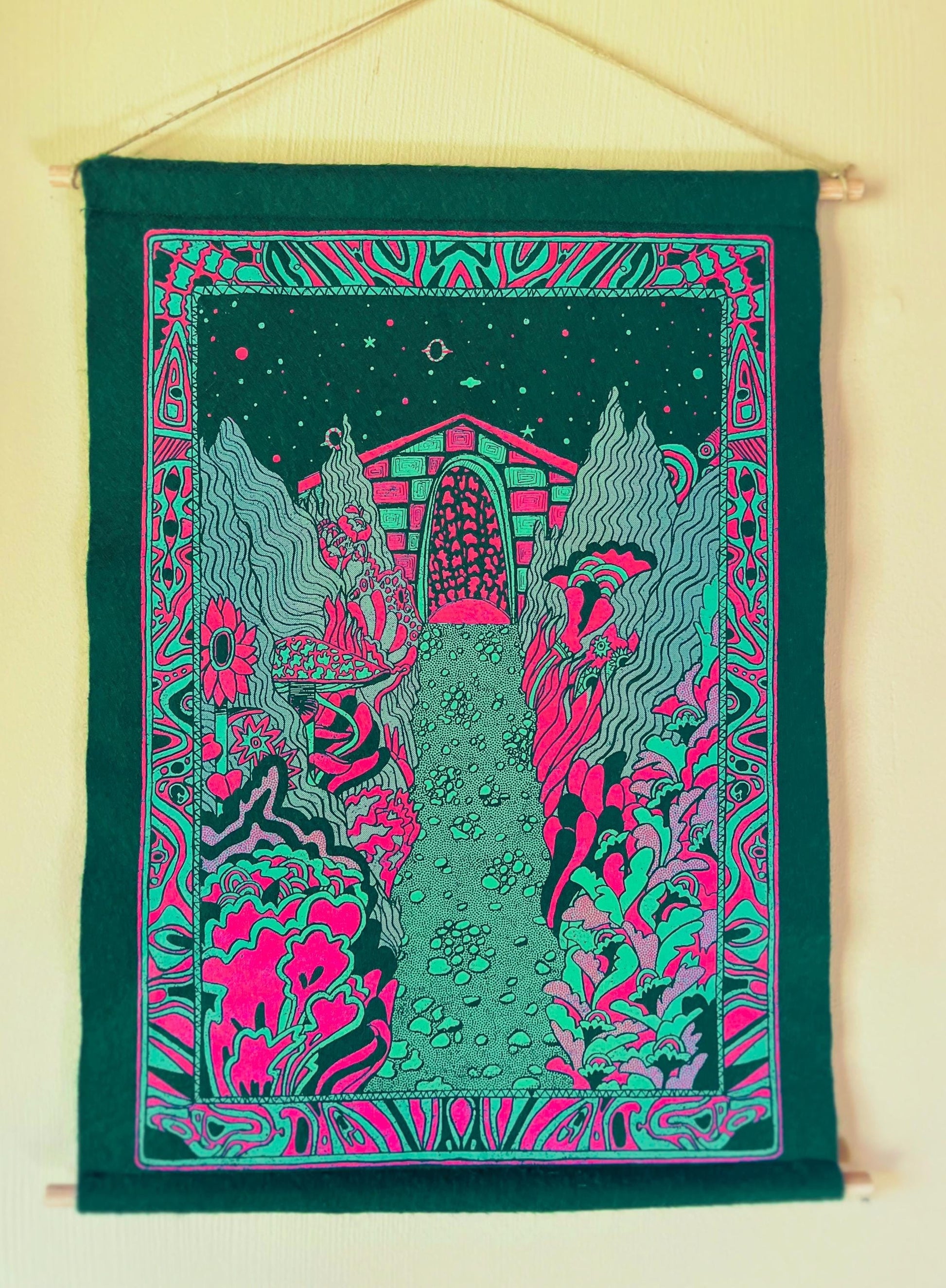 My Hand drawn "Garden Path" artwork vibrantly printed on archival quality felt and made ready to hang. Features a portal door with psychedelic plants, mushrooms and stars.